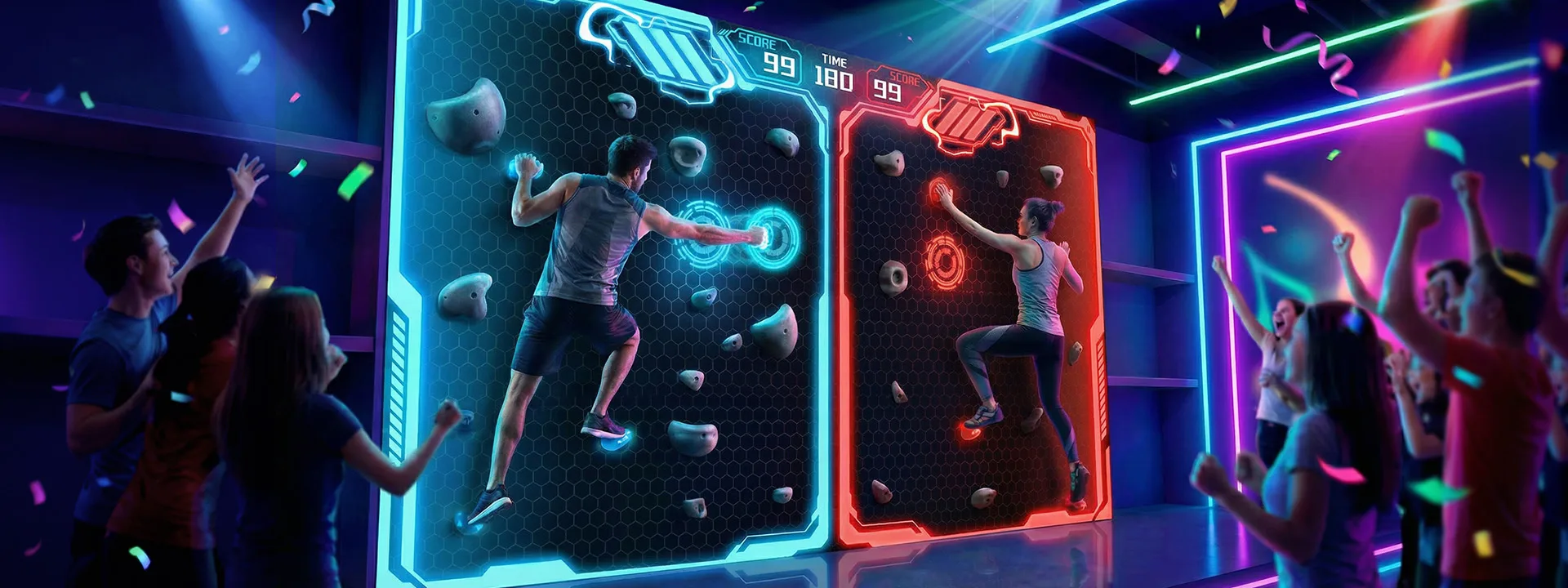 The Augmented Climbing Wall gamifies climbing through interactive projection, adding target hits, route missions, and dynamic visual feedback to create an immersive experience that increases venue appeal, dwell time, and repeat visits.